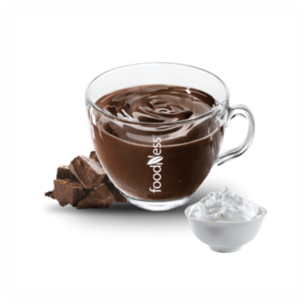 Postupne pridajte obsah papierového vrecúška do 100-120ml, 3,5% mlieka. Pre vegánov je ideálne použiť Sójový nápoj od Foodness. Za stáleho miešania ohrievajte až k bodu varu, kým nedosiahnete požadovanú konzistenciu. A môžete si vychutnať svoju šálku čokolády.