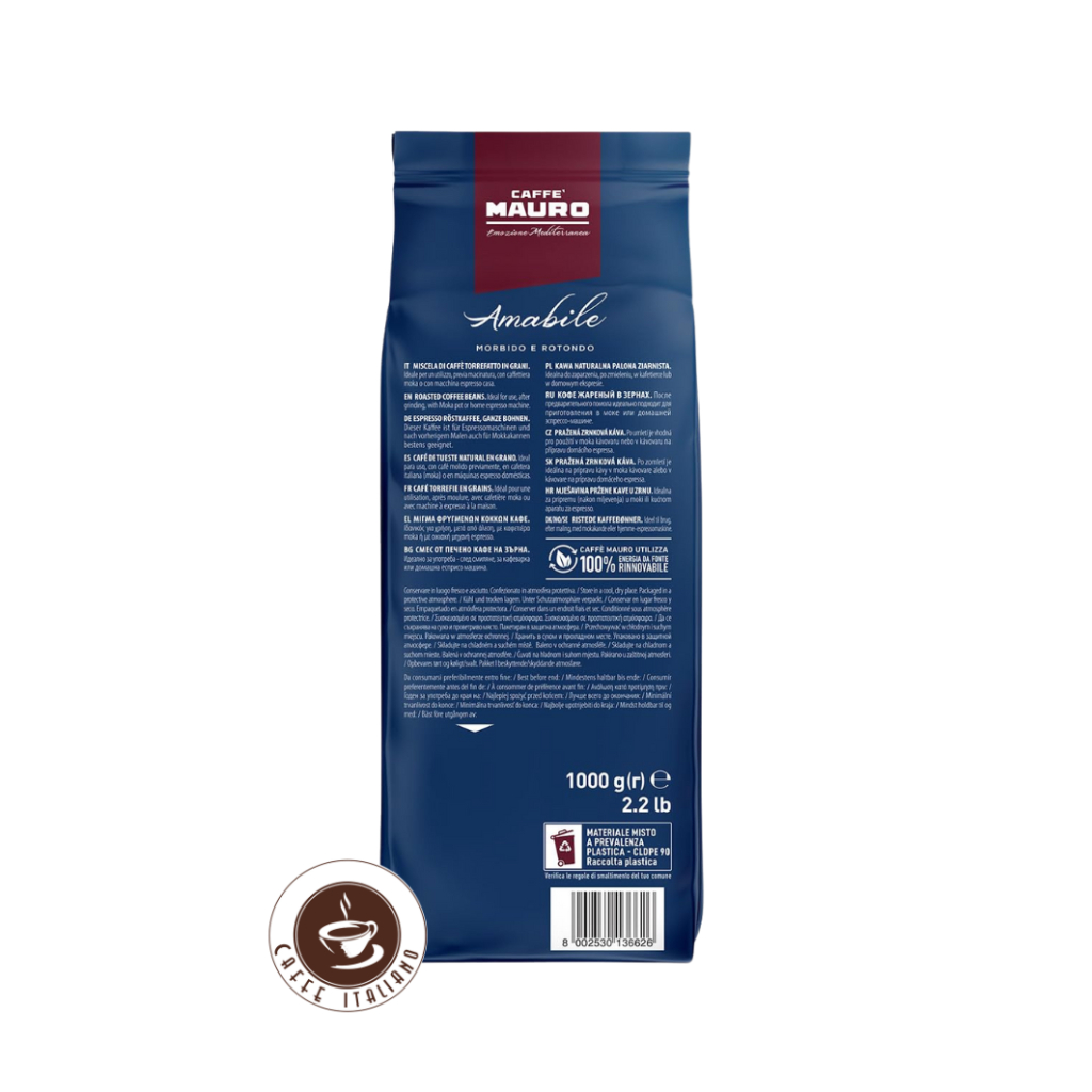 Mauro Amabile 1 kg je dokonale vyvážená zmes arabiky a robusty, ktorá spája jemnosť s intenzitou a prináša komplexný chuťový zážitok. Zrná pochádzajú zo starostlivo vybraných plantáží v Indii a Strednej Amerike, kde sú pestované v ideálnych klimatických podmienkach. Vďaka tmavšiemu talianskemu praženiu získava káva plné telo, minimálnu aciditu a bohatú arómu, ktorá ulahodí milovníkom klasického espressa aj jemnejších mliečnych káv.