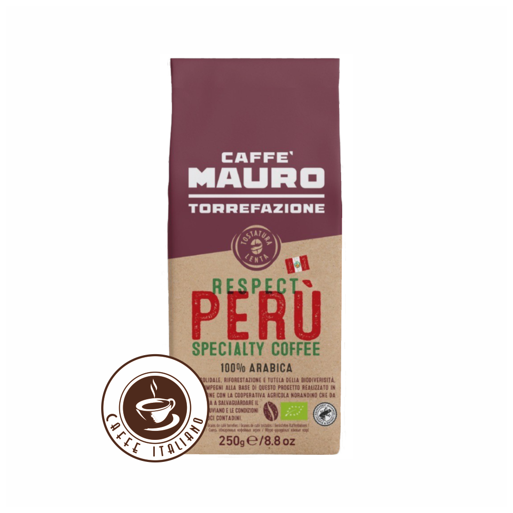 MAURO Respect PERU 100% Arabica je zmes najlepších kávových zŕn Arabica z peruánskych plantáží Južnej Ameriky. Káva s intenzívnou vôňou a mierne sladkastou kvetinovou chuťou a jemnou čokoládovou arómou. Pre svoje stabilné telo, miernejšiu aciditu, ovocné a kvetinové tóny a jemnú čokoládovú arómu sa odlišuje od ostatných juhoamerických káv.