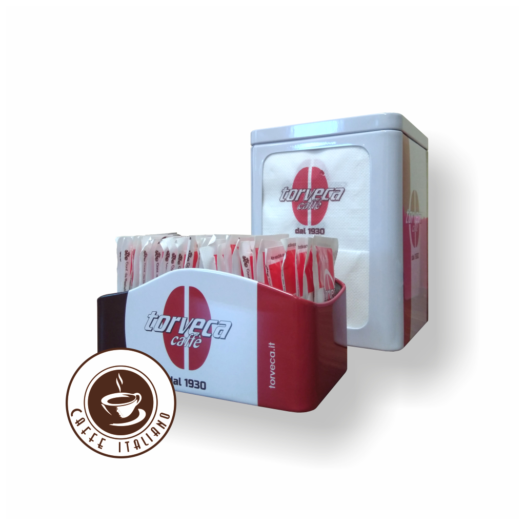 Sada držiakov na cukor a na servítky od značky Torveca. Ideálne na vybavenie kaviarne. Vhodné i na pekné chvíľky na terase, s Vašou obľúbenou kávou. Na navodenie tej správnej atmosféry talianskej kaviarne. V ponuke aj iné príslušenstvo od značky Torveca, ako napríklad šálky, cukor, servítky, kávové zrná v čokoláde..
