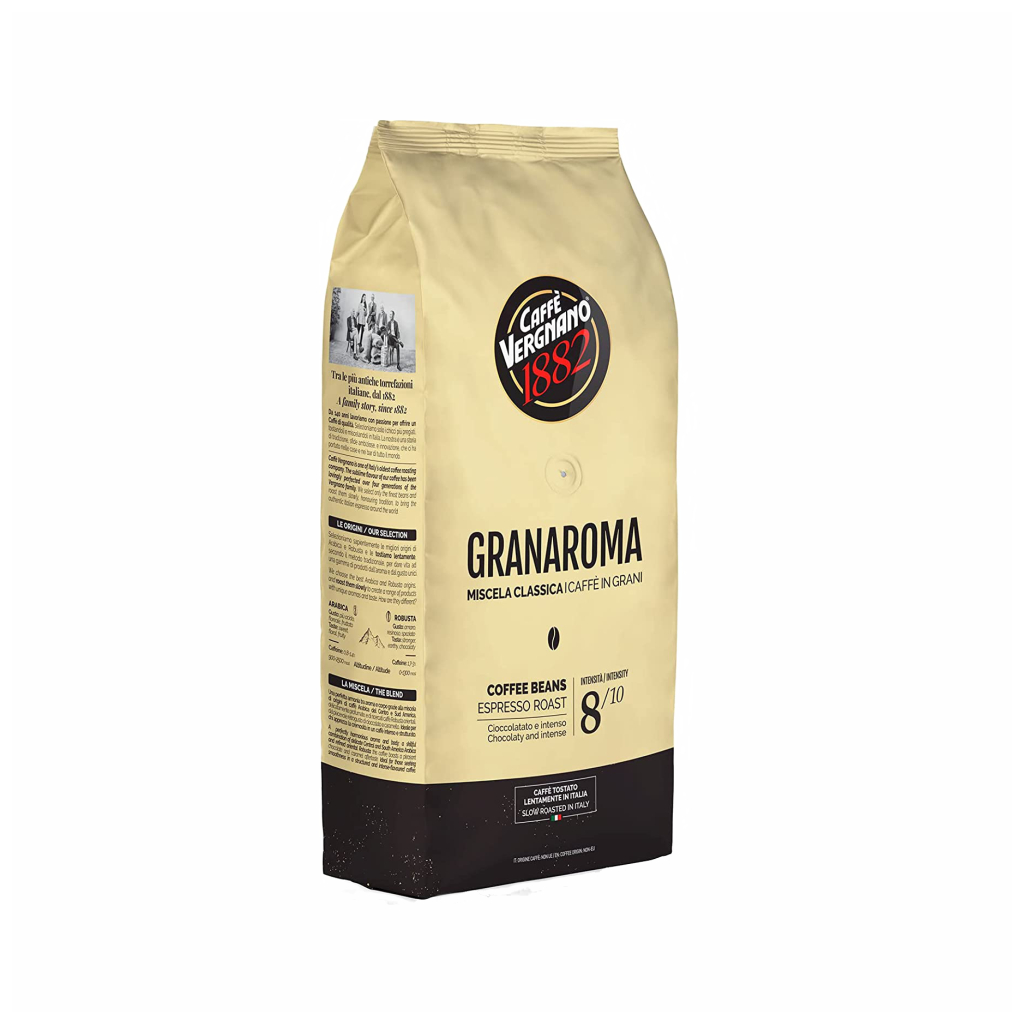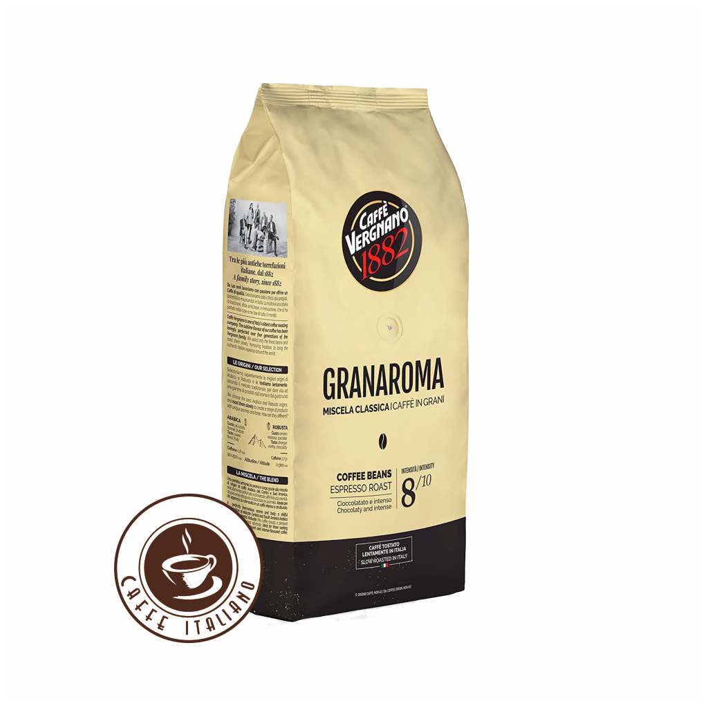 Vergnano Gran Aroma Bar je zmes 40% Robusty a 60% Arabiky. Fantastická chuť kávy je dosiahnutá pomalým pražením kávy. Zrná Arabiky sú pôvodom zo Strednej Ameriky a zrná Robusty sú z Afriky. Káva je pražená tradičnou pražiarňou v Turíne a má vyšší obsah kofeínu. Intenzívna chuť, výrazné telo a tóny korenistej čokolády. Vergano káva má veľmi malú kyslosť a hustú crému. Ideálna na prípravu cappuccina a latte.