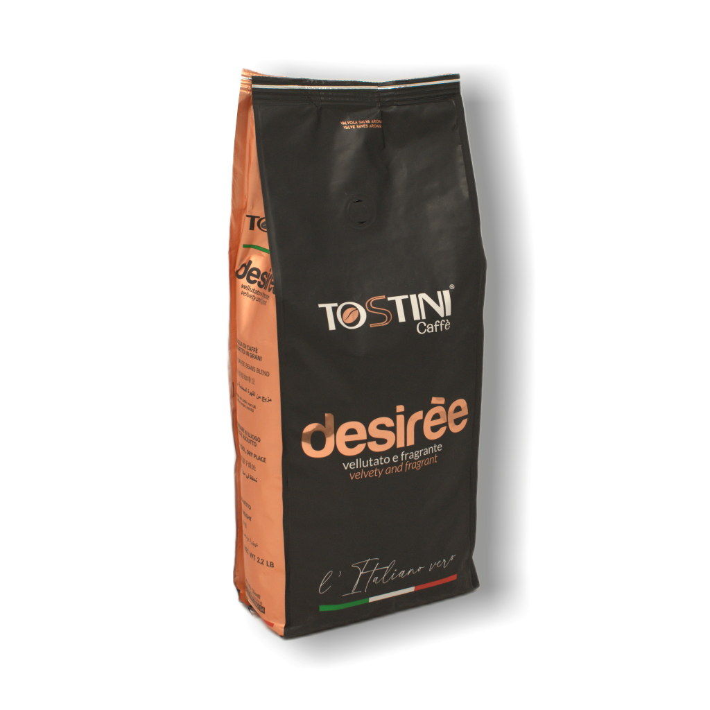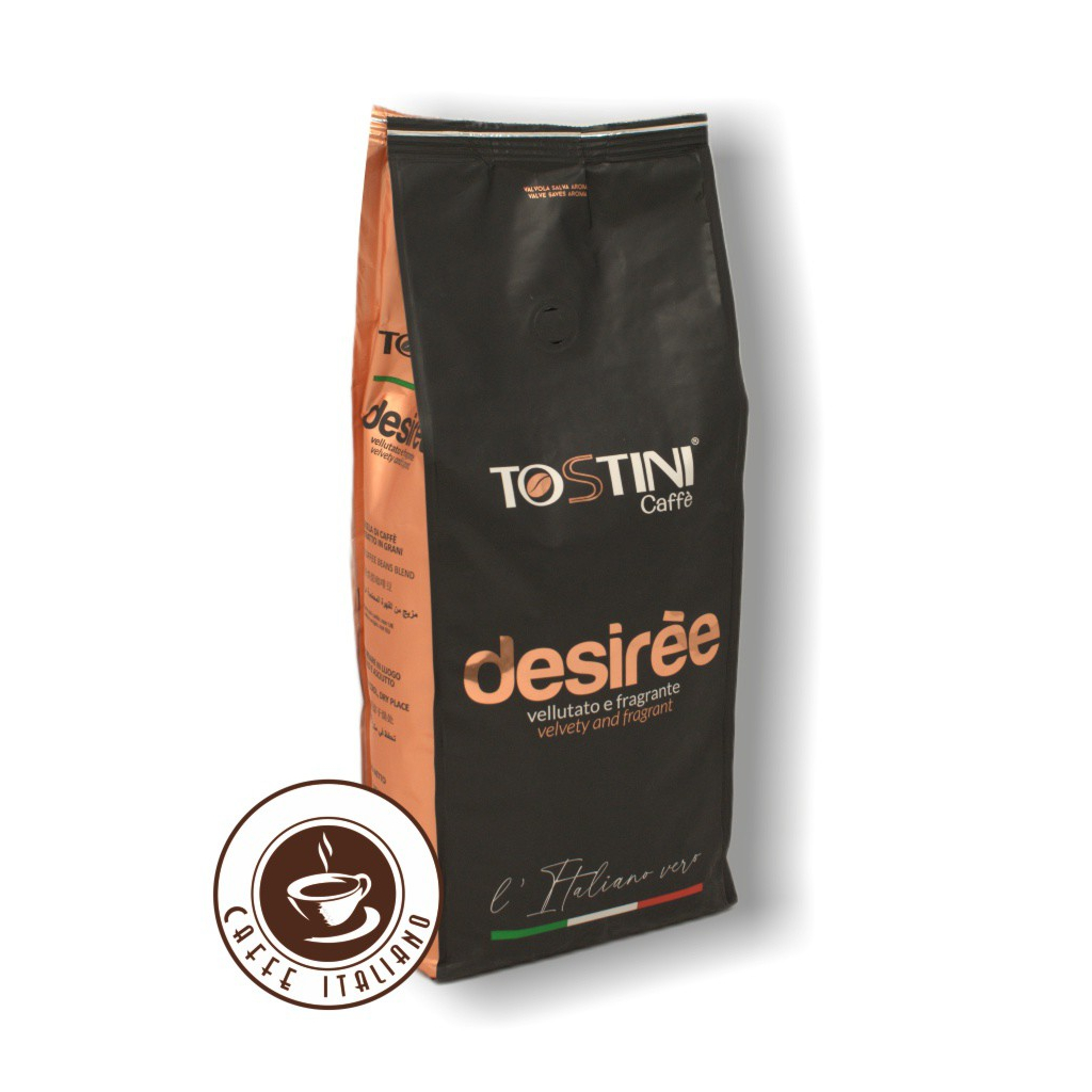 Zrnková káva Tostini Desirée má silný temperament doplnený o jemnú kyslosť. Má zamatové telo a príjemnú vôňu liekových orieškov a pražených mandlí, s jemnými tónmi zrelého ovocia na podnebí.